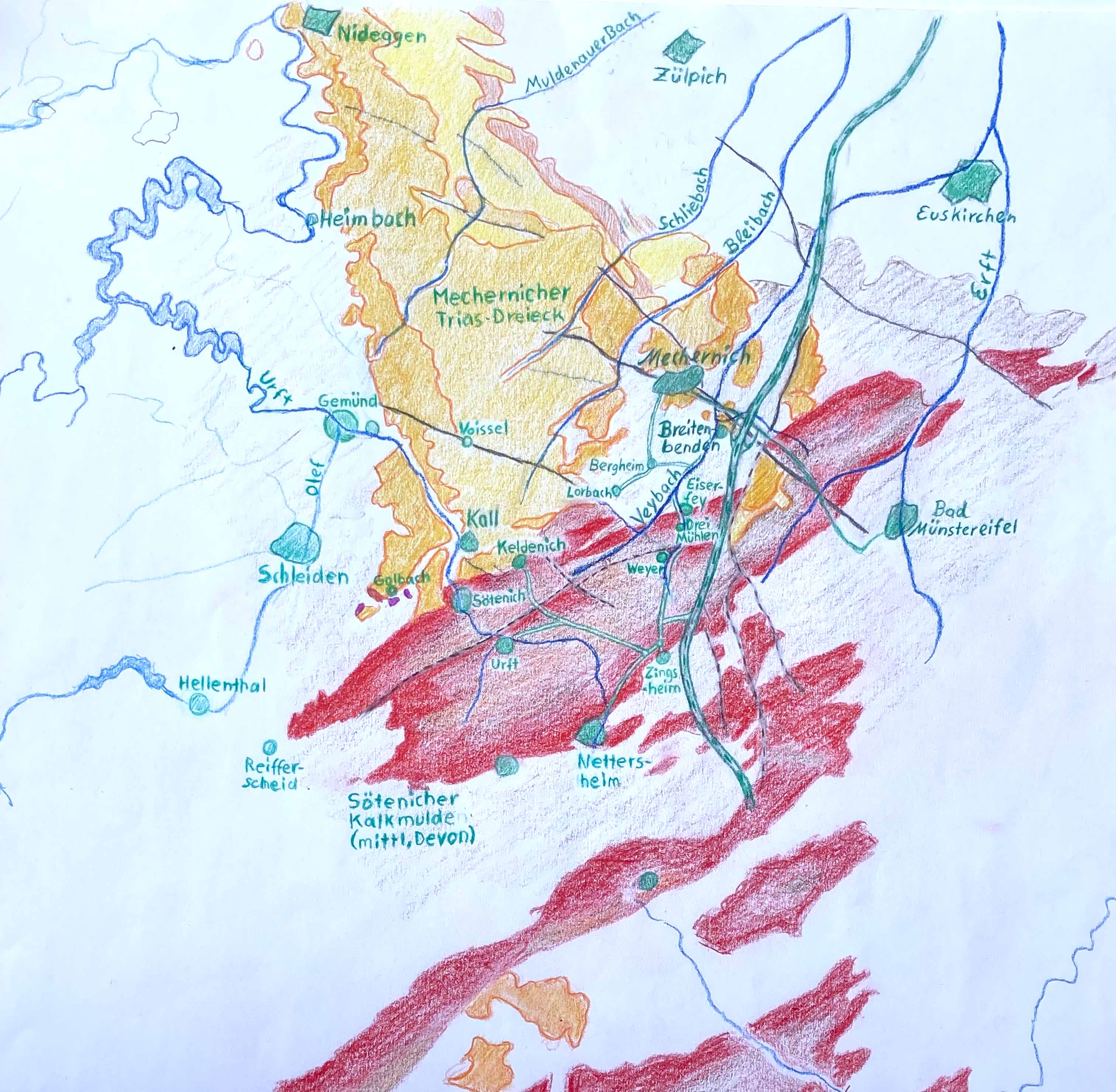 Gemünd, wo Olef und Urft zusammenfliessen, Eisenerz im Konglomerat, Eisenwerk Mauel, in der Umgebung von Voissel |