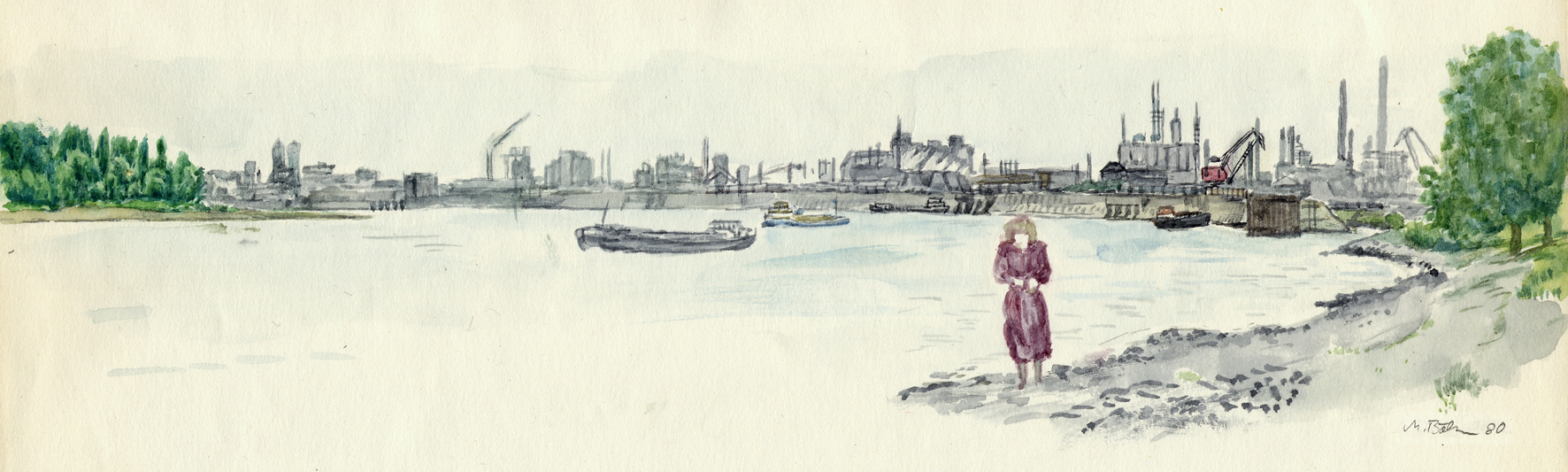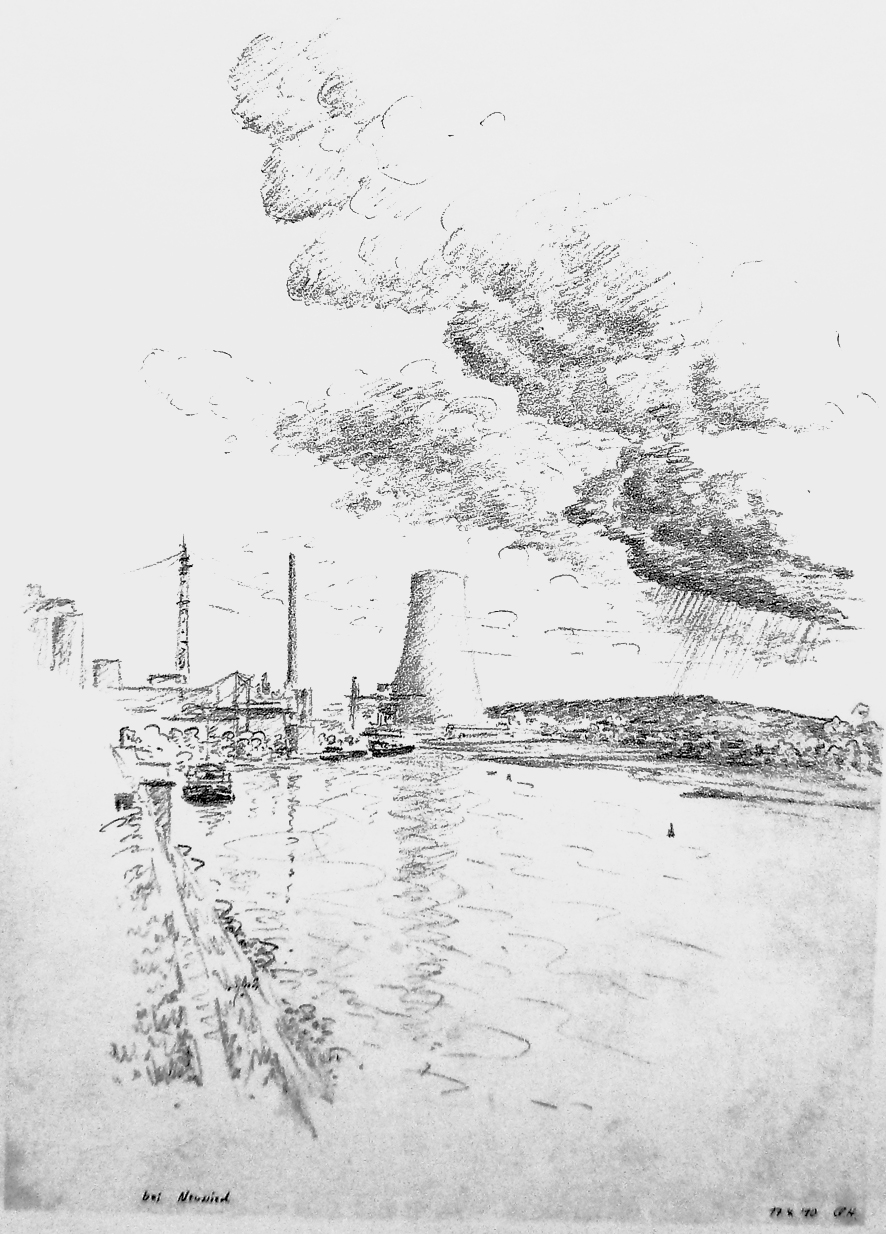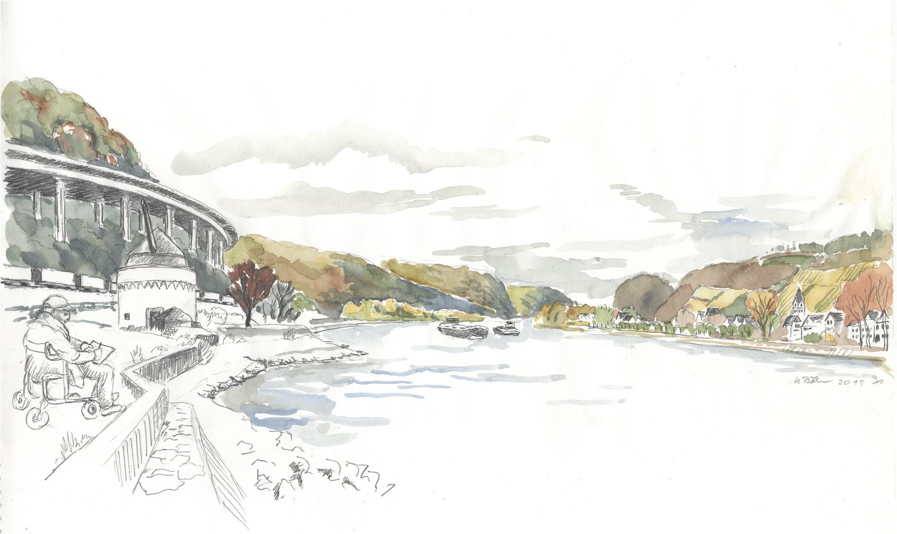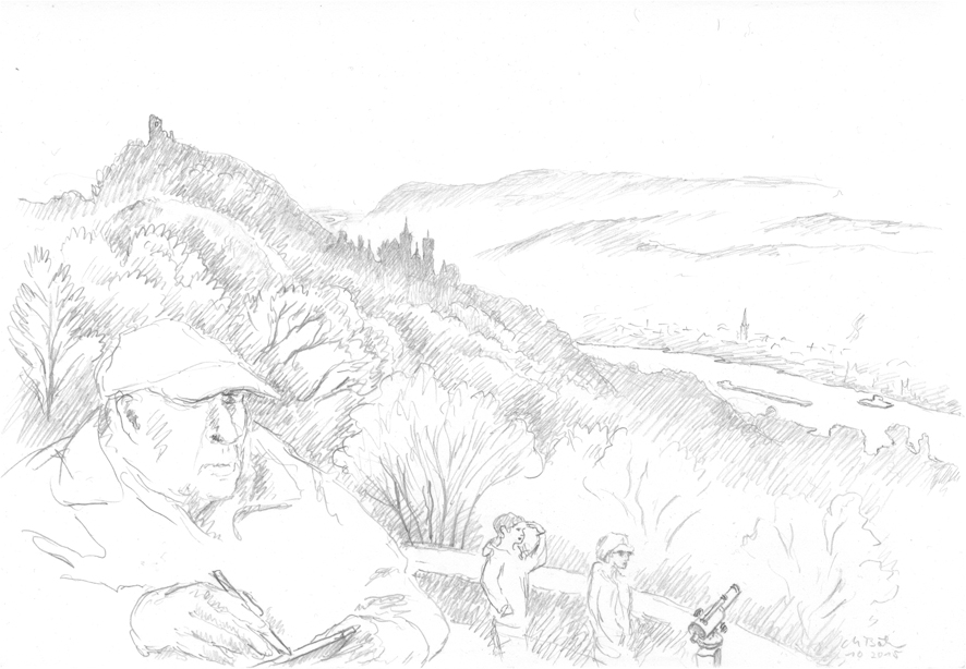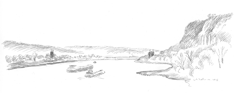 Blick von Andernach rheinabwärts nach Norden. Die Strasse auf riesigen Pfeilern so rücksichtslos und gigantisch dass sie fast schon wieder originell ist; überall in der Region von Koblenz bis Remagen sind solche Strassenführungen zu sehen. Die Stadt Andernach hat eine großenteils erhaltene Altstadt; die Uferseite ist genial versaut in einer einzigartigen landschaftlichen Lage. Papa zeichnet auch. | ||