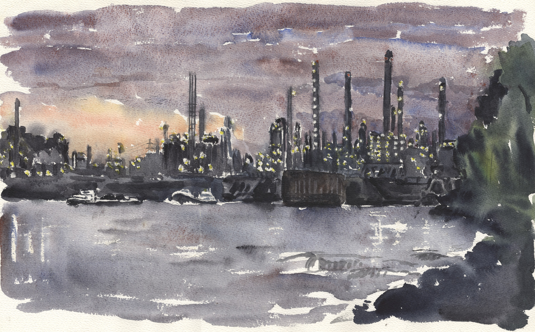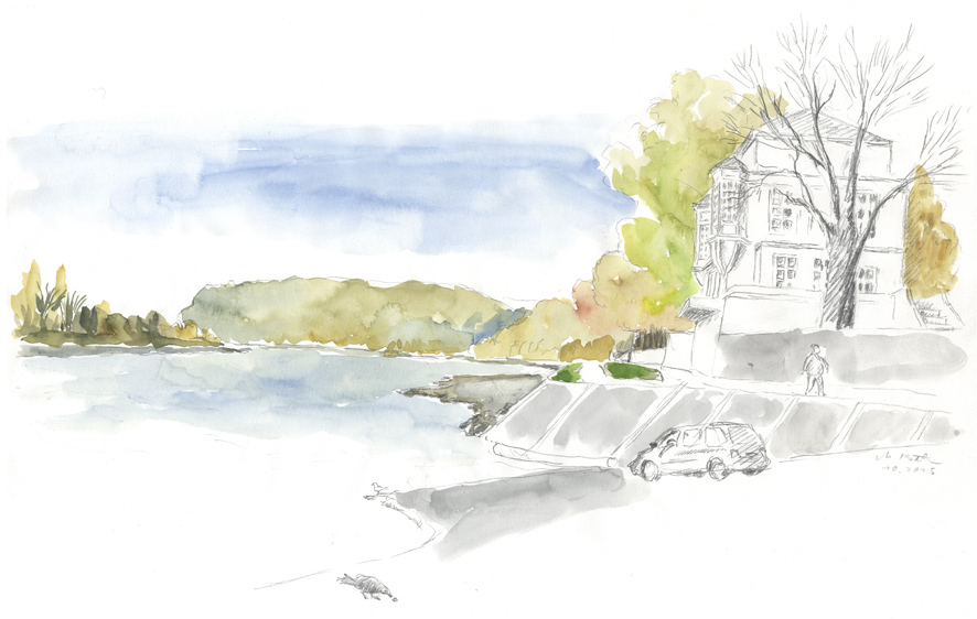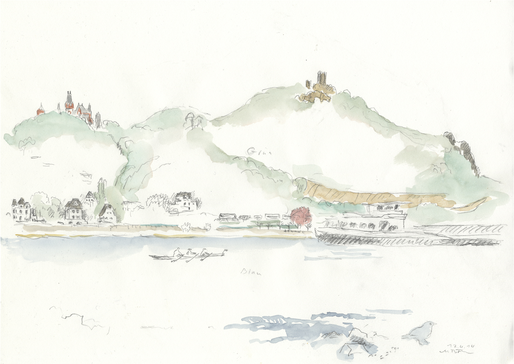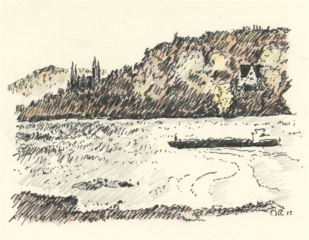 Blick von Andernach rheinabwärts nach Norden. Die Strasse auf riesigen Pfeilern so rücksichtslos und gigantisch dass sie fast schon wieder originell ist; überall in der Region von Koblenz bis Remagen sind solche Strassenführungen zu sehen. Die Stadt Andernach hat eine großenteils erhaltene Altstadt; die Uferseite ist genial versaut in einer einzigartigen landschaftlichen Lage. Papa zeichnet auch. | ||