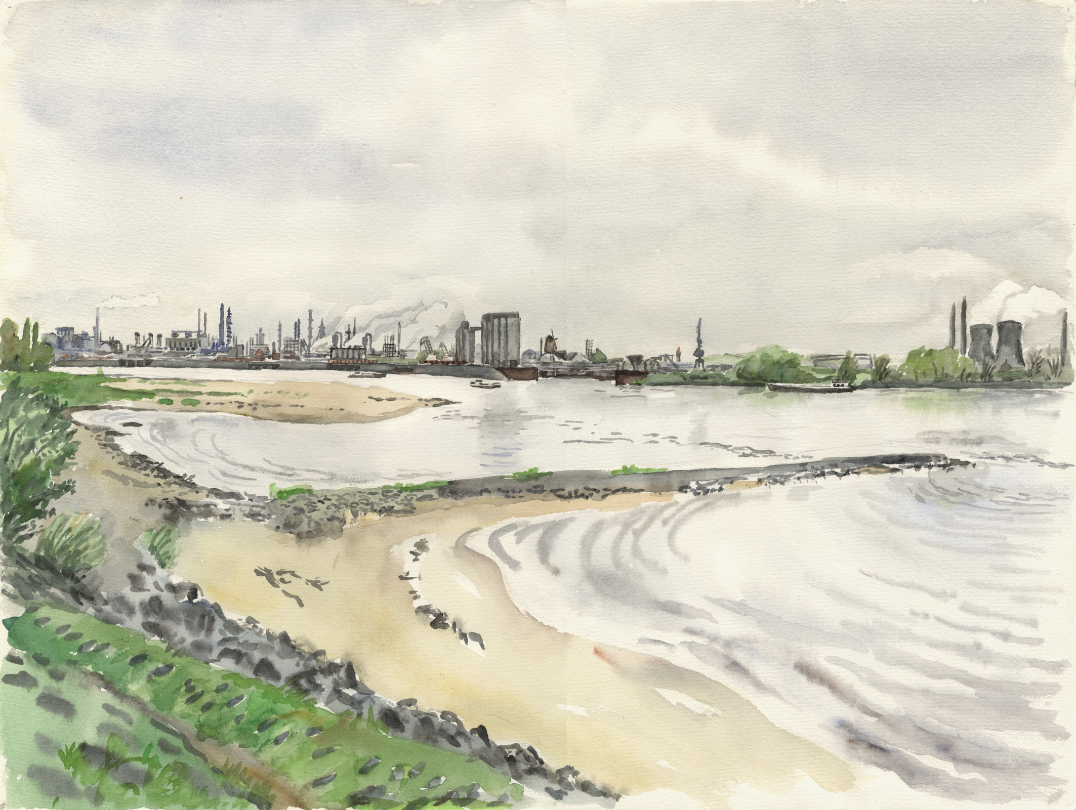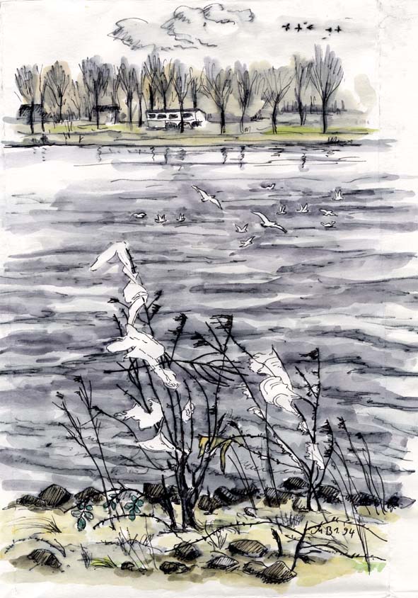 6-K-xx-Aq-WesselvonLangeln-xxxx | Wesseling vom anderen Ufer bei Langel aus. Was fehlt: die Krähe, die immer wieder Muscheln aus einiger Höhe auf die steinige Kribbe fallen lässt, um sie zu knacken. | ||