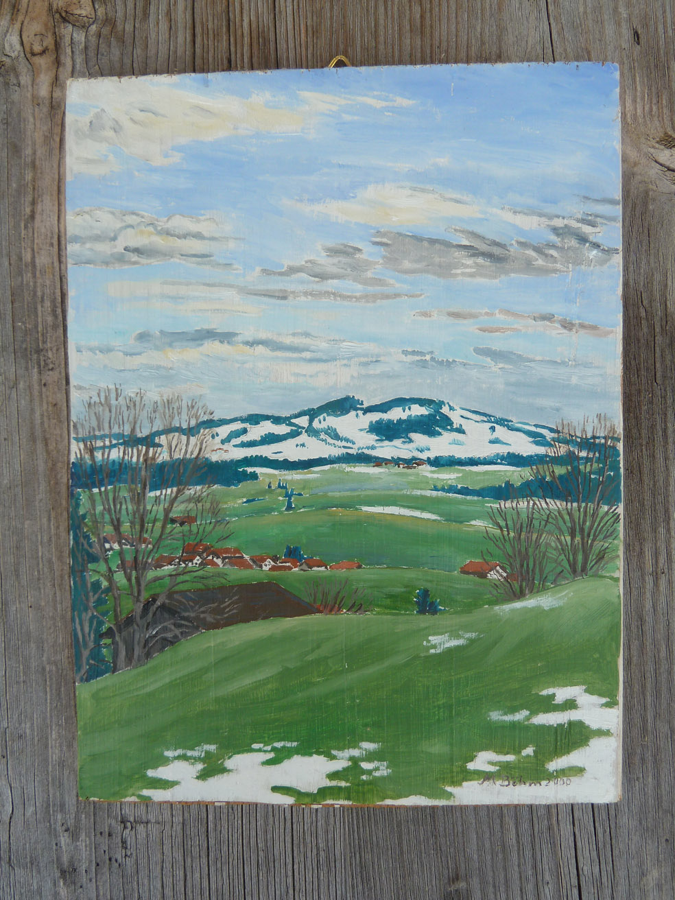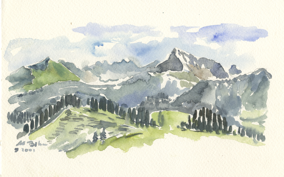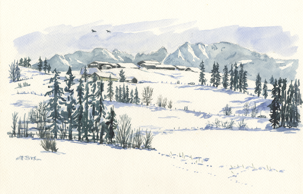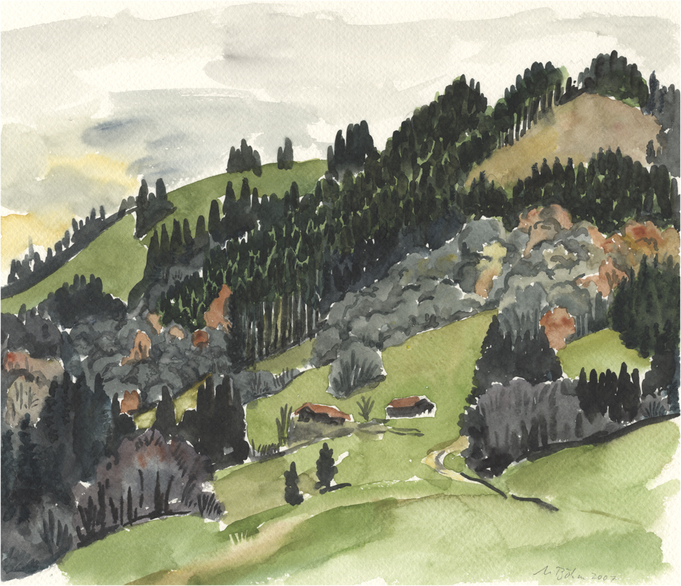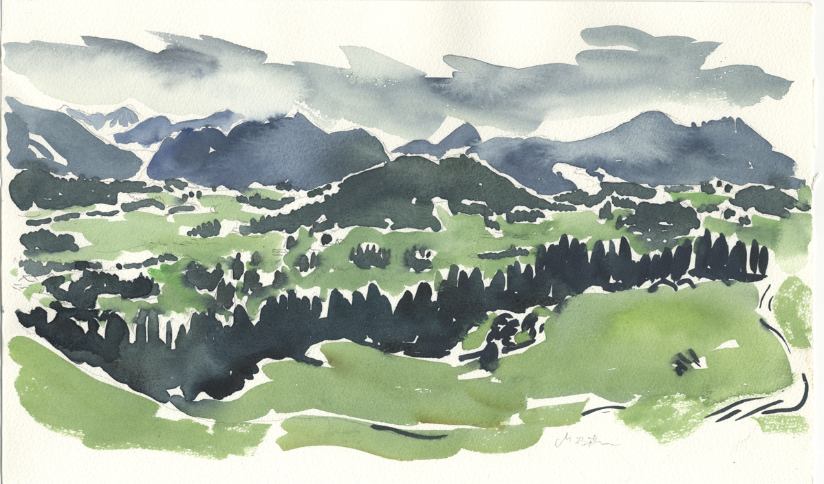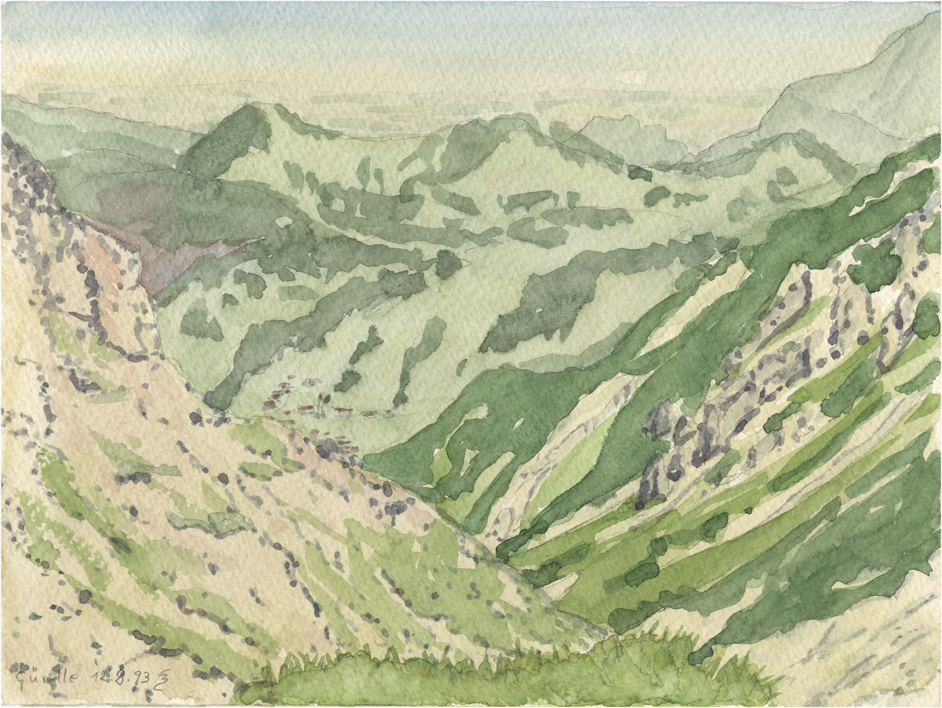 vom Güntle,Blick hinunter nach Schattwald und hinüber zum Schönkaler (von meinem Bruder Peter gemahlt) | |||