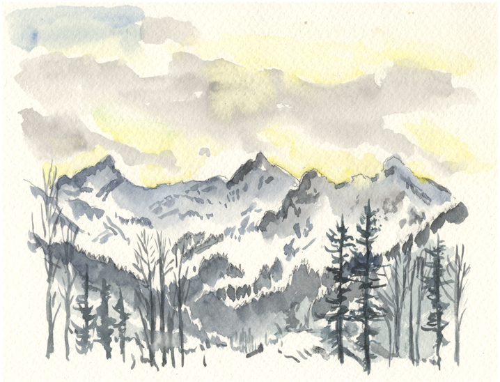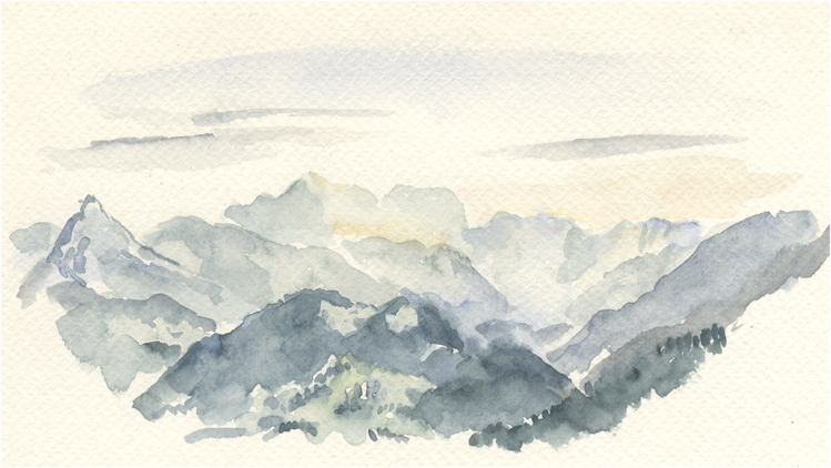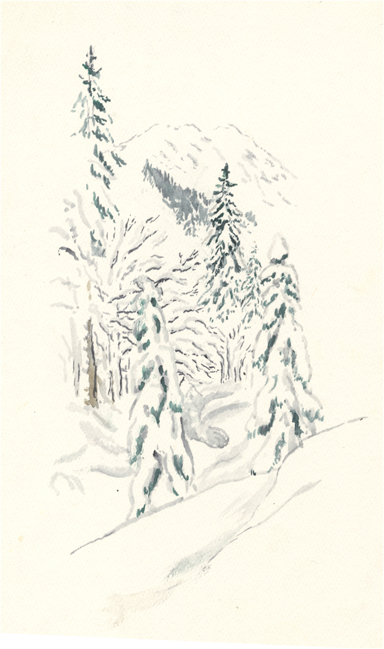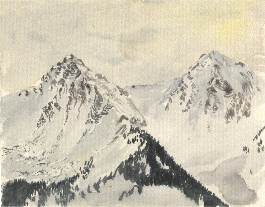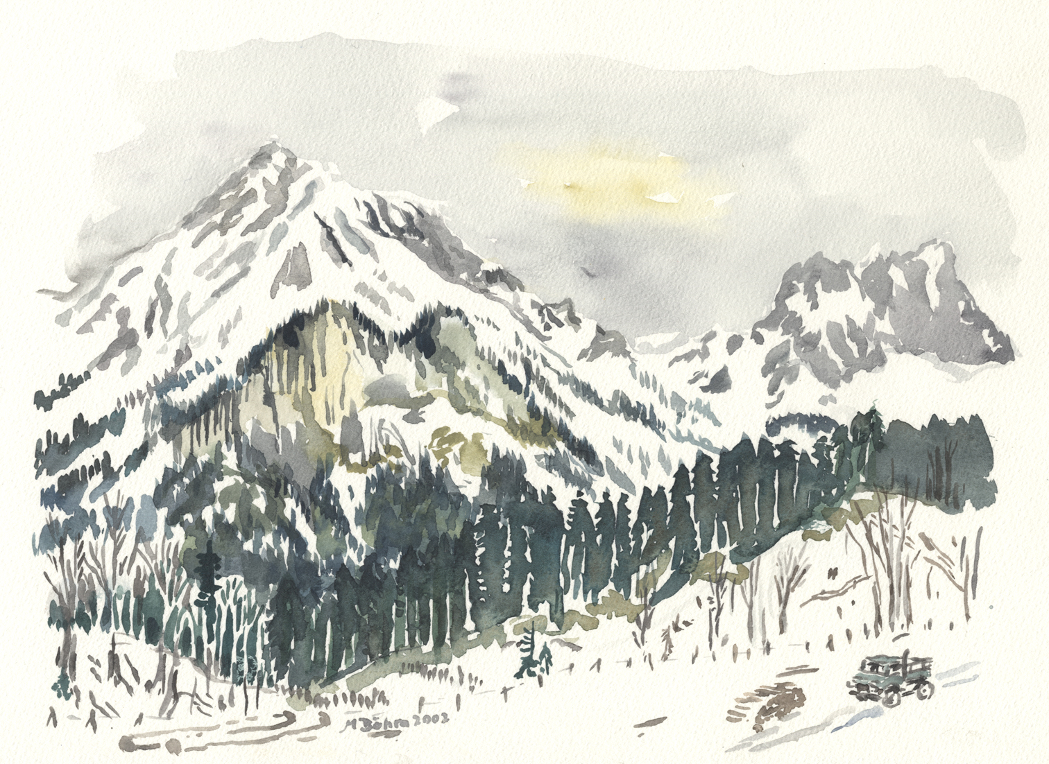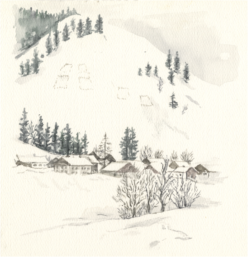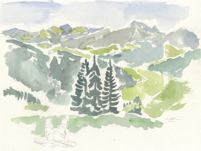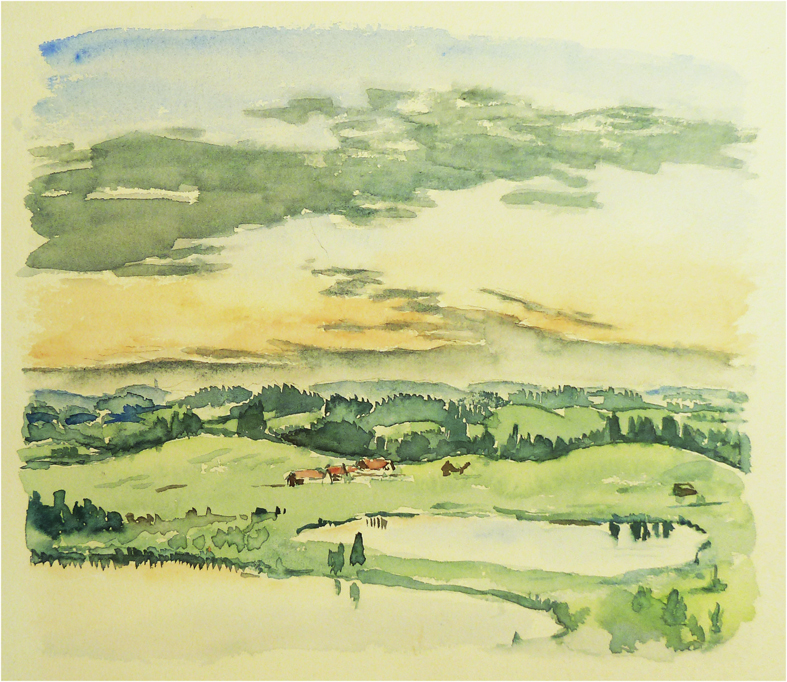 vom Güntle,Blick hinunter nach Schattwald und hinüber zum Schönkaler (von meinem Bruder Peter gemahlt) | |||