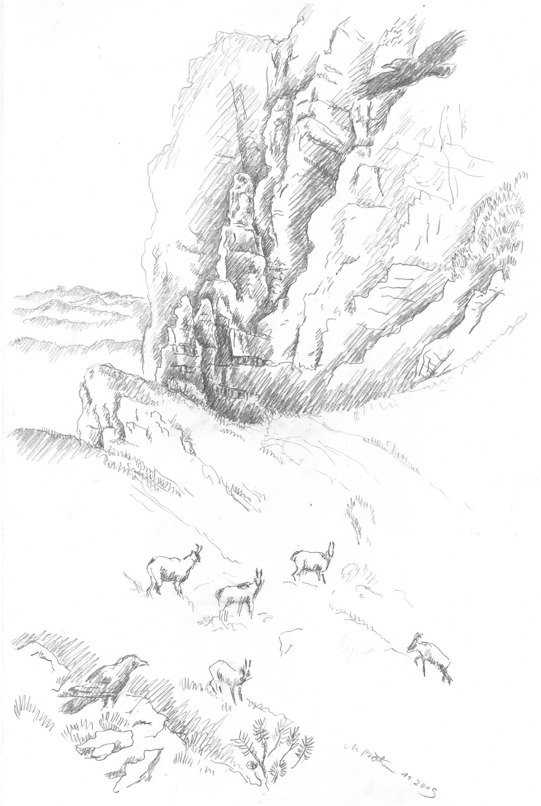 am Güntle zwischen Bscheißer ud Ponten, Felsen, Dohlen, Gemsen | |||