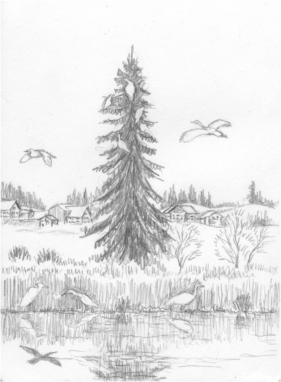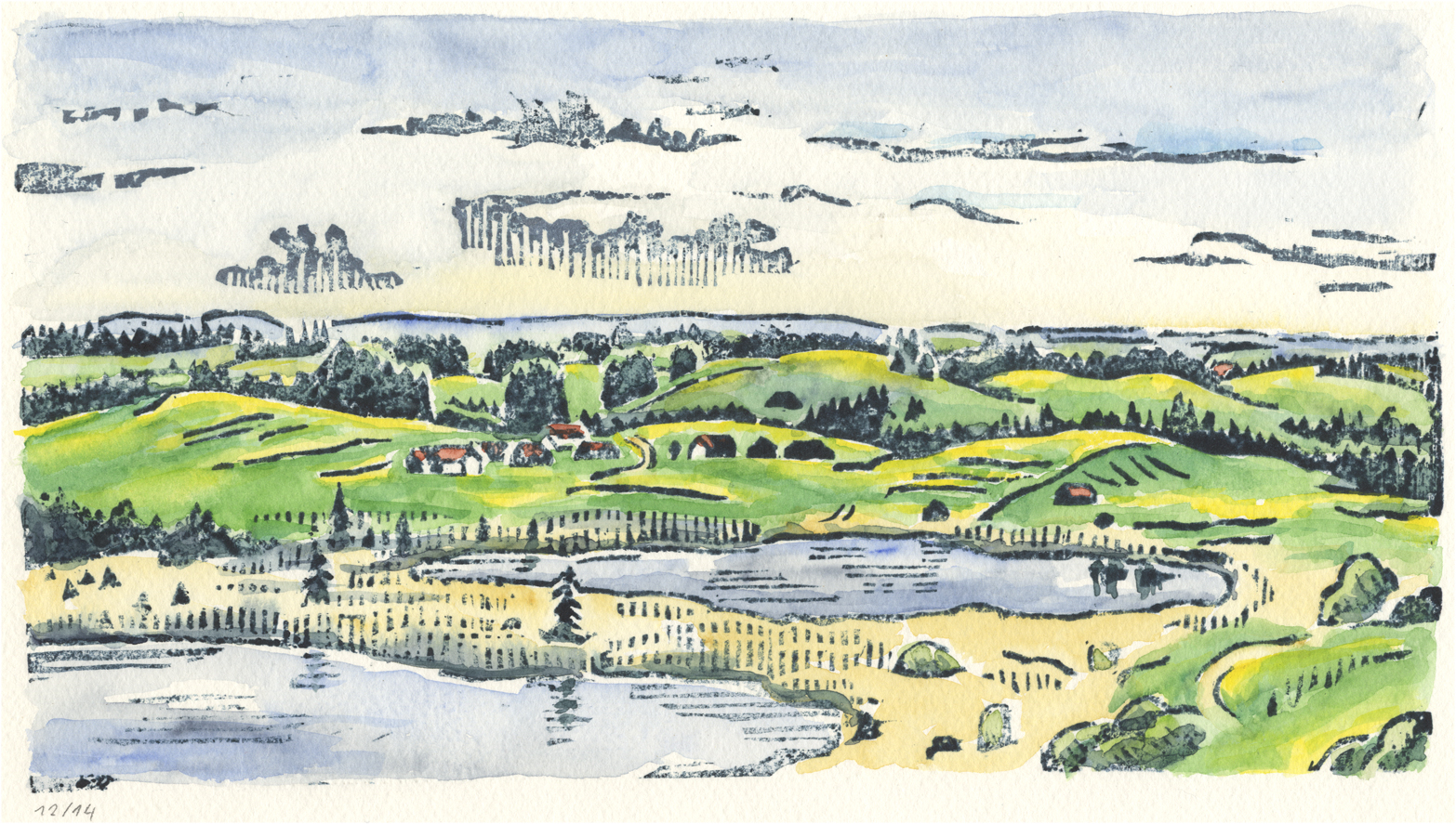 Farbholzschnitt Seeger Seen, zur Zeit der Löwenzahnblüte |